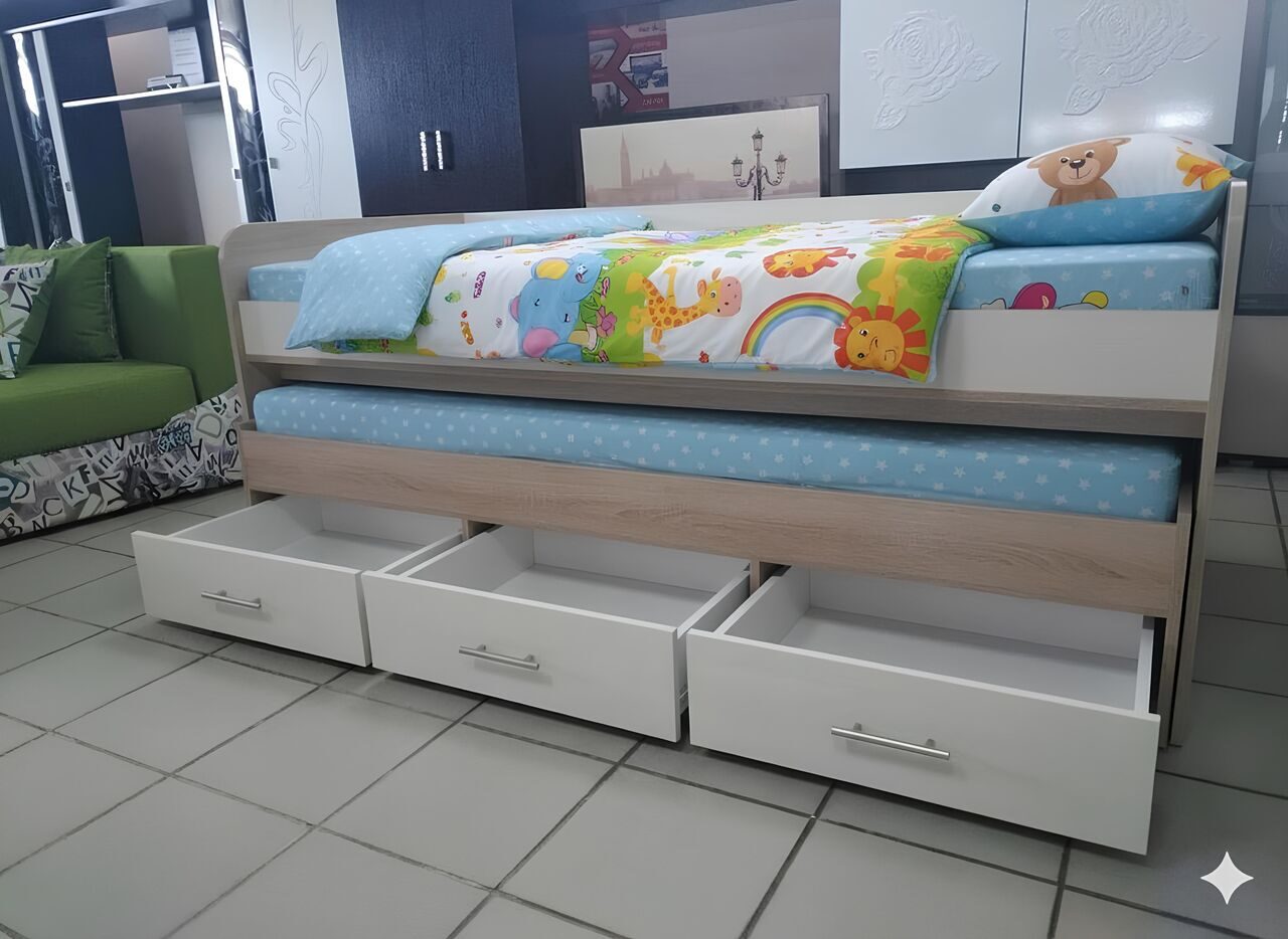 Кровать двухъярусная –трансформер с выдвижным спальным местом и шуфлядами на металлических направляющих.